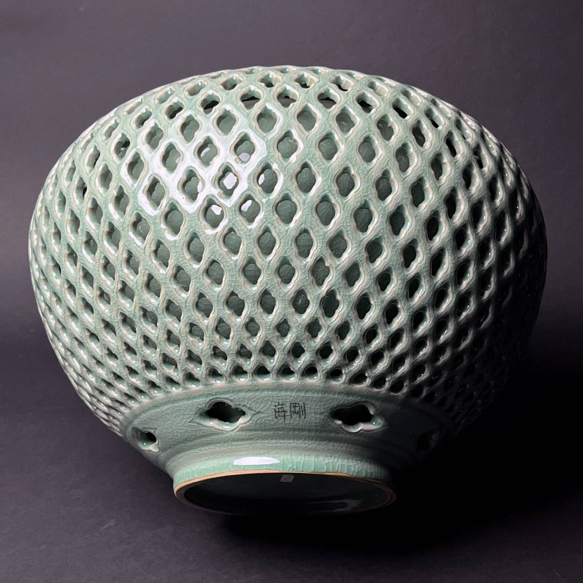 韓国人間文化財 (人間国宝) 【初代柳海剛(柳根瀅)】 秀逸作 高麗青磁 二重透彫大花瓶 共箱